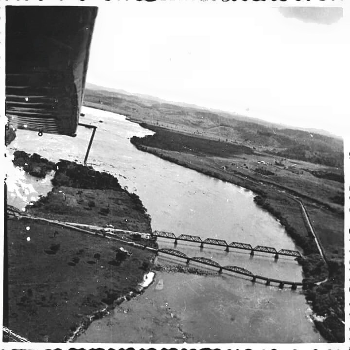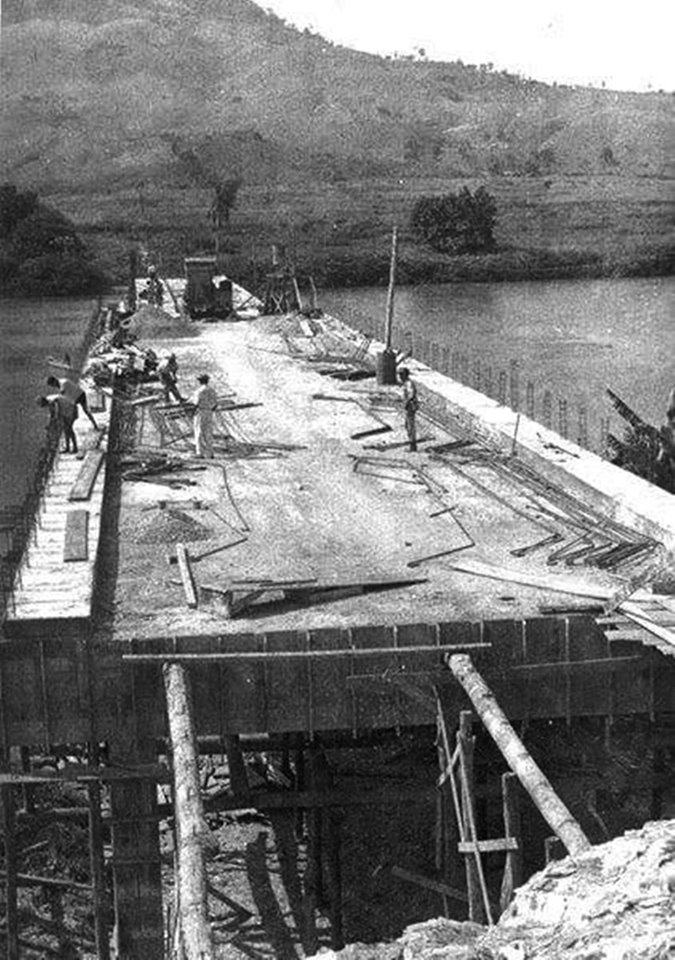 Década 1940 - Balsa de travessia sobre o Rio Doce, durante a construção da "Ponte São Raimundo" - Rio Bahia.