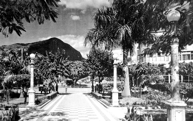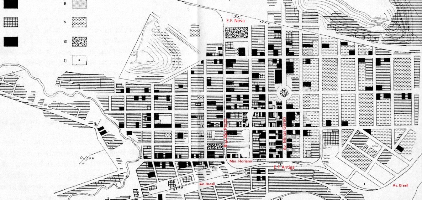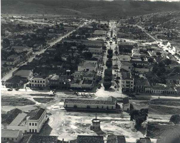 Estação Ferroviária Antiga ao centro Mal. Floriano c/ Av MG e o Coreto(edificação circular, demolido em 1963), e o edifício do "Grande Hotel", à esquerda. Num segundo plano, a Av. Minas Gerais(com arborização central) e, paralelas a ela, a Rua Peçanha, à esquerda, e a Barão do Rio Branco, à direita.