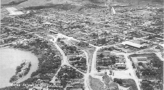 1956 - Ao centro da foto a Rua Peçanha. A direita, a Rua Belo Horizonte e à esquerda a Av. Minas Gerais. Ao fundo a Ilha dos Araújos praticamente desabitada.