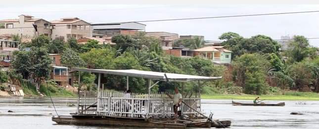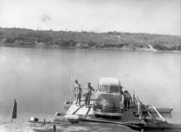 Década 1940 - Balsa de travessia sobre o Rio Doce, durante a construção da "Ponte São Raimundo" - Rio Bahia.