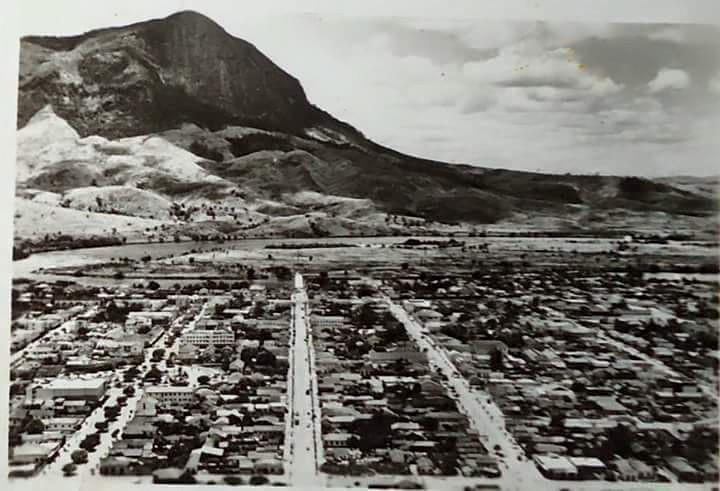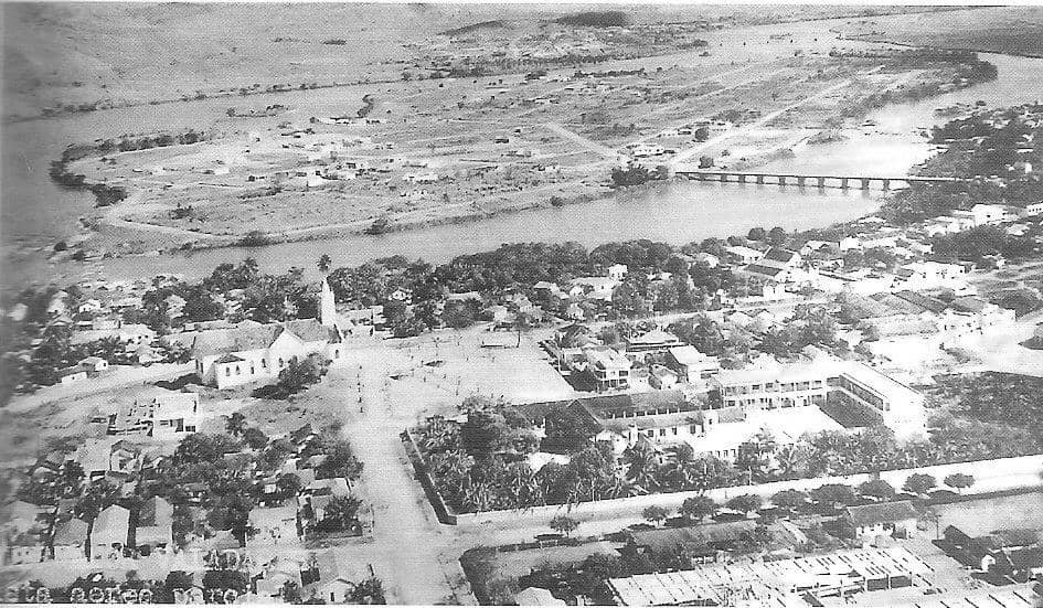 1956 - Ao centro da foto a Rua Peçanha. A direita, a Rua Belo Horizonte e à esquerda a Av. Minas Gerais. Ao fundo a Ilha dos Araújos praticamente desabitada.