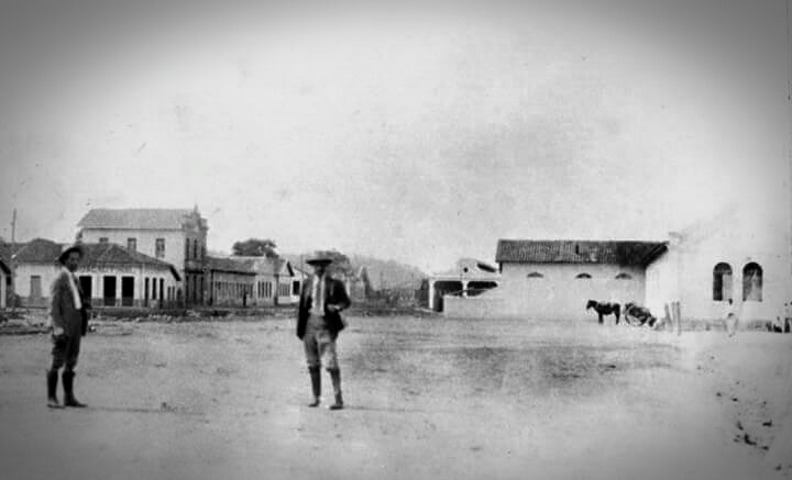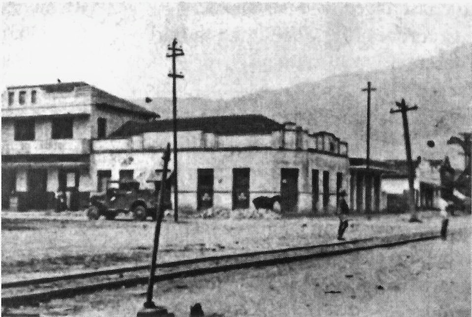 Rua Marechal Floriano, antigo pátio de manobras da Estrada de Ferro Vitória-Minas(atual Praça dos Pioneiros). Destacam-se, à direita, os fundos da "Antiga Estação Ferroviária". À esquerda, na esquina, o "Armazém Said Hilel"(atual edifício Rio Doce) e o sobrado do farmacêutico "Otávio Soares Ferreira".