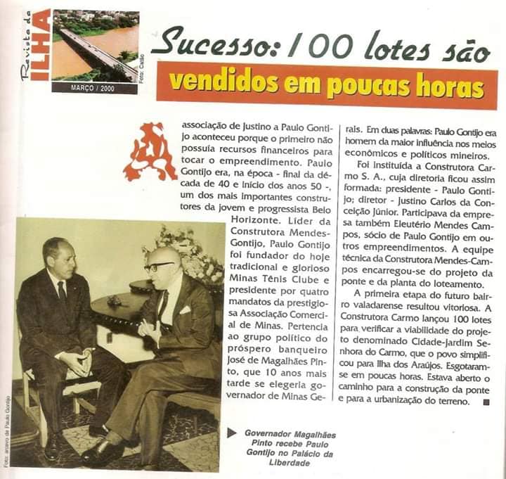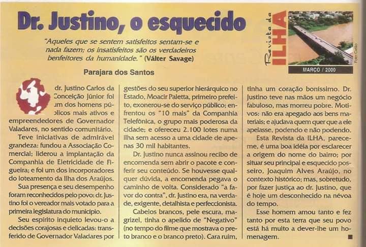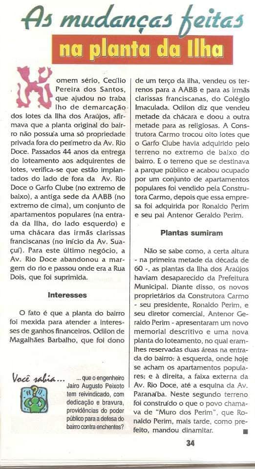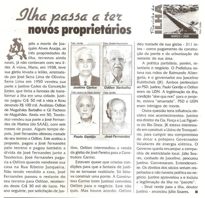 ILHA DOS ARAUJOS: pertencia a D. Maria Araújo, que vendeu a família do sr José Serra Lima, depois para Dr Justino, que a transformou em bairro. Nome oficial é Cidade Jardim Nossa Sra. do Carmo.