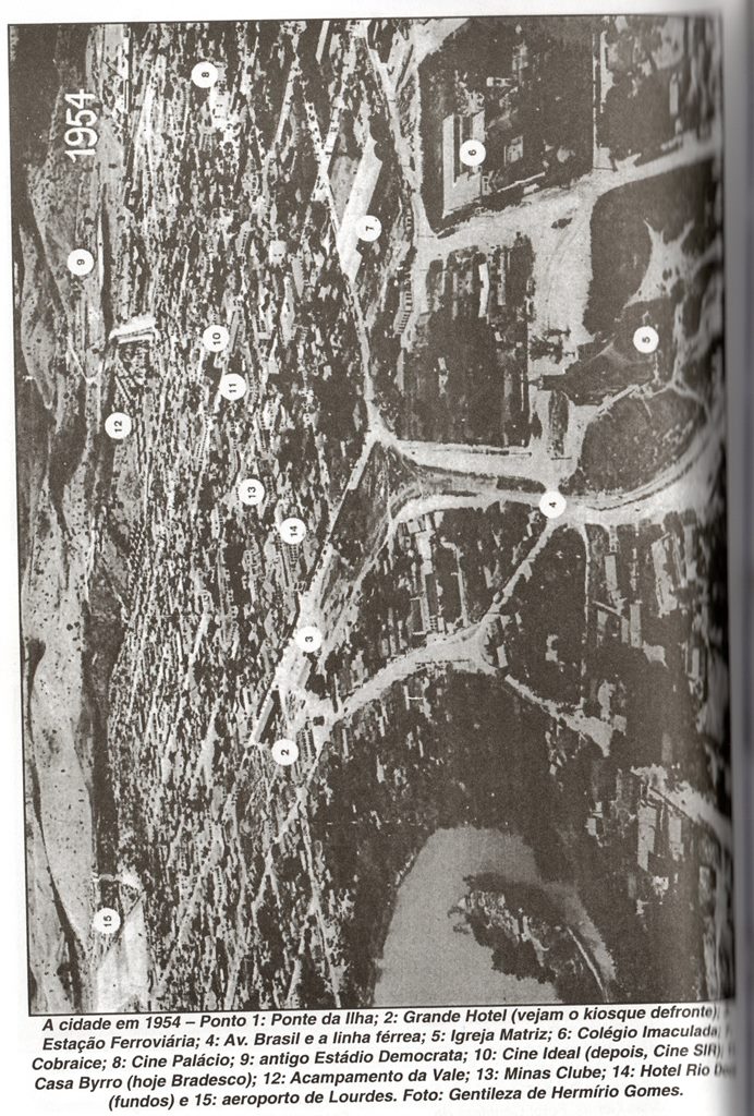 Estação Ferroviária Antiga ao centro Mal. Floriano c/ Av MG e o Coreto(edificação circular, demolido em 1963), e o edifício do "Grande Hotel", à esquerda. Num segundo plano, a Av. Minas Gerais(com arborização central) e, paralelas a ela, a Rua Peçanha, à esquerda, e a Barão do Rio Branco, à direita.